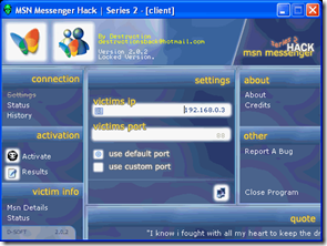 - Tramite social enginering:Molti malintenzionati possiedo contatti strani che a prima vista potrebbero fregarvi per esempio:Staff-MSN@hotmail.it...con questi contatti i malintenzionati si fingono dello staff di msn chiedendo i vostri dati (password, mail, etc..) a causa di un problema o di qualche altra stupida scusa, voi ingenuamente li inviate e automaticamente vi hanno rubato la password....Questa tecnica viene utilizzata sia contattandovi su Msn che tramite e-mail...Vi ricordo che lo staff di msn non vi contatterà mai e poi mai chiedendovi i vostri dati tramite e-mail o tramite msn...!