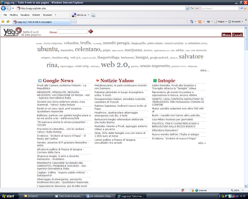 Yagg è un single page aggregator ispirato al celebre Popurls, la sua funzione è quella di proporre su una pagina aggiornata in tempo reale i contenuti più caldi e le novità più interessanti del web, aggregando immagini, video, notizie e post dalle migliori fonti in lingua italiana.